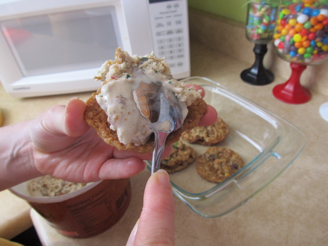 Top the ice cream with another cookie and use the spoon the smooth around the edges.