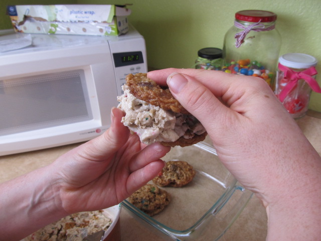 I started by baking some frozen cookie dough I had in the freezer. I used the Pioneer Woman’s Monster Cookie recipe I blogged a few weeks ago. Feel free to use any drop cookie recipe you like. Here are some of our favorites: