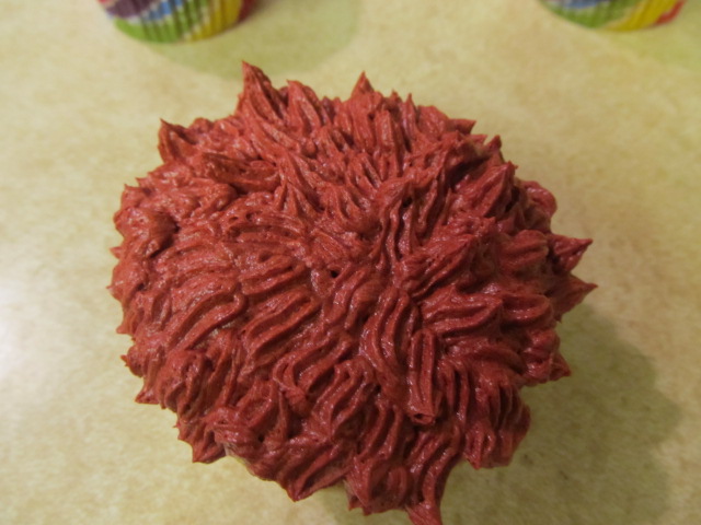 Then put the remaining color in two piping bags. For Elmo, I used a Wilton number 18 piping star tip.