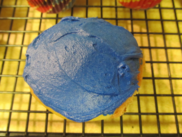 Divide the frosting in half and dye one part blue and one part red. The blue was no problem. I used a gel food coloring and needed about 1/2 t to make it blue. The red on the other hand… took an entire bottle. I ended up adding one tablespoon of cocoa to make it darker without adding more coloring. It made Elmo a little bit maroon, but no one complained.