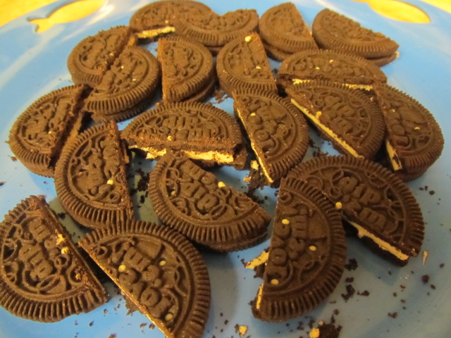 Before you start piping, cut 12 Oreo cookies (or the generic equivalent) in half.