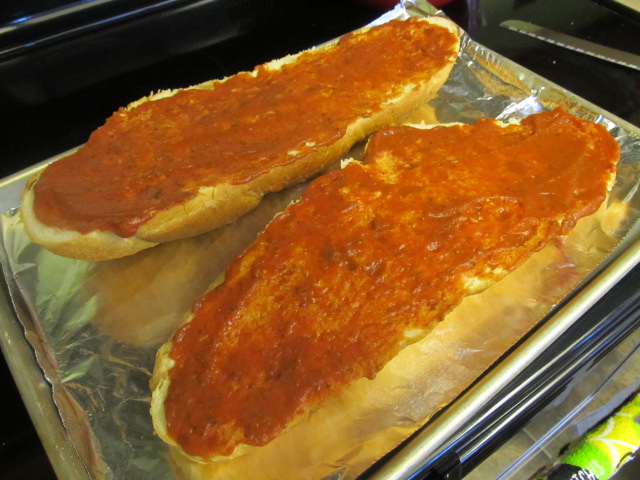 Start with….. french bread. Just buy a loaf at the grocery store and cut it in half length-wise. Now line a long baking sheet with foil (because it’s Saturday night and I don’t want to scrub a pan) and put both pieces of the bread on the sheet, cut side up.