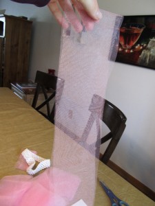 - Begin folding it up, and up and up. When you finish, you’ll end up with a large tube of tulle.