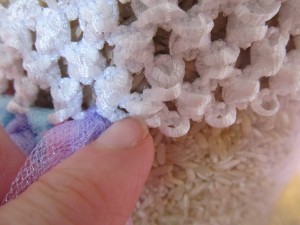 - If you’re doing several colors, just alternate here. If you’re doing a double-layer tutu (that’s what I did), put the next piece of tulle in the hole diagonally above the first and tie it in another double knot. Then put the next piece in the next bottom hole (it’s easy to accidentally skip a bottom hole. Be sure you get all the holes filled in.