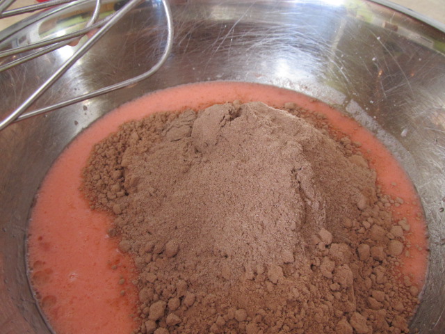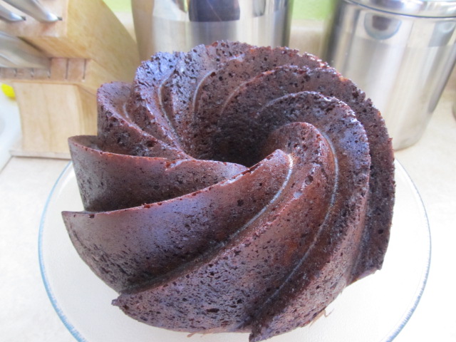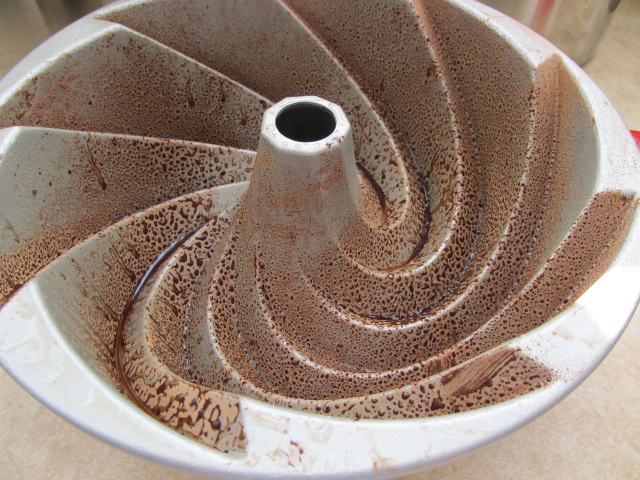 Pour the mixture into a greased bundt pan. I get very grumpy when I  make a beautiful bundt cake, but it’s covered in white goo from the flour I used to grease the pan. To avoid this, I sprayed my pan with non-stick spray and dusted it with cocoa powder. I’m totally okay with cocoa residue sticking to my cake.