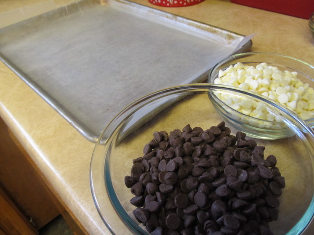 Start out by lining a cookie sheet with wax paper, and pouring one bag of white chocolate chips and one bag of milk chocolate chips into microwave-safe bowls.
