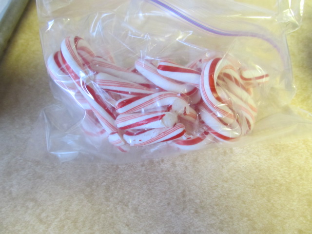 Then crush some peppermint candy. We used mini candy canes because they are the easiest to crush. Double bag about 15 candy canes and then pound them with a rolling pin. Be sure to get most the air out, or you’ll have an explosion… like I did. OOPS! Don’t worry if you have the same mishap. Just put the whole thing in one more bag and get back to smashing.