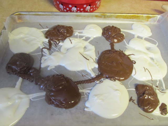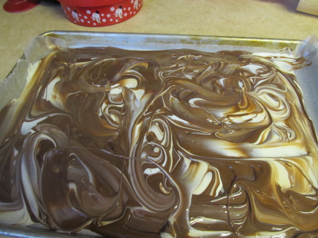 Then dollop the chocolates alternately on the wax paper. Don’t worry about being too precise  In the end, I just started throwing chocolate anywhere. It can’t taste bad no matter how you distribute it!
