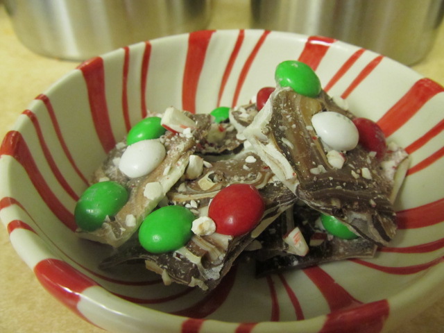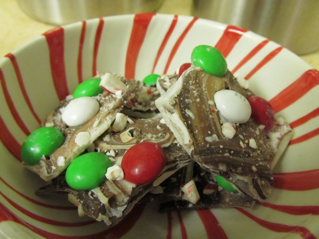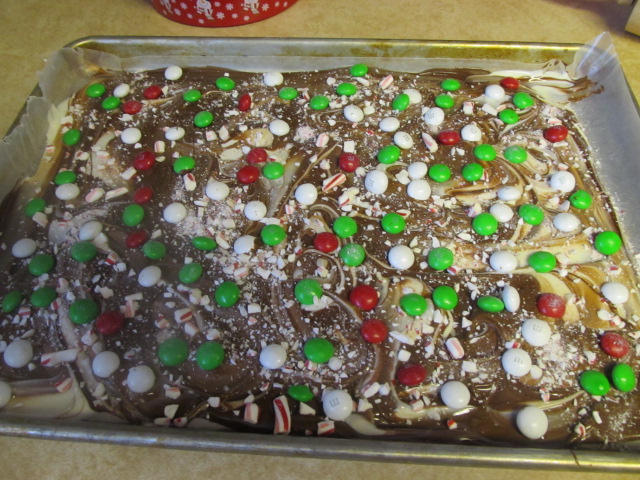 Next was the fun part, especially for my kids. Sprinkle the candy canes over the melted chocolate (do this as soon as the chocolate is spread. If it’s too set, it won’t stick). Then pout about 1 1/2-2 C mint chocolate M&Ms over the bark and press down gently with your hands.
